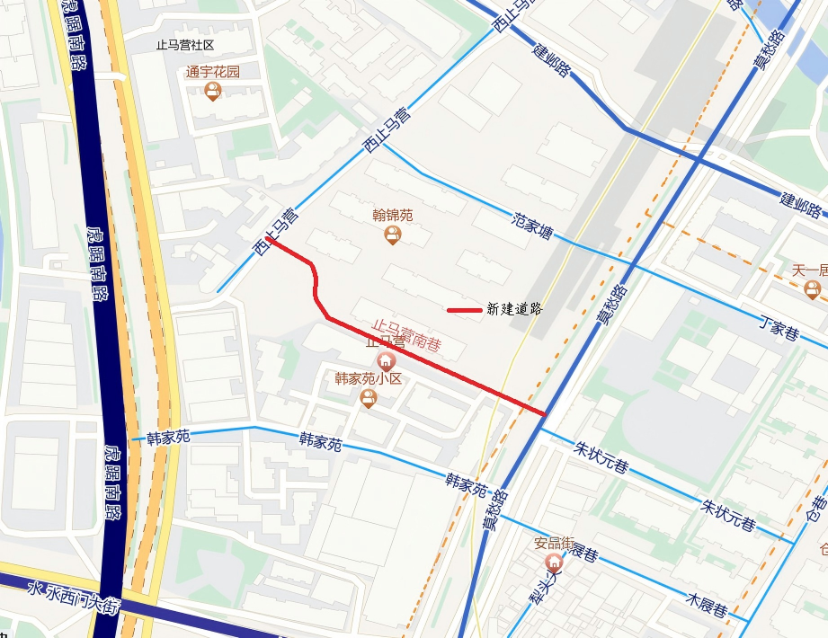止马营南巷(Zhǐmǎyíng Nánxiàng):位于朝天宫街道,东西走向,东起莫愁路,西止西止马营路,长202.73米、宽7米,沥青路面;道路等级:城市支路。