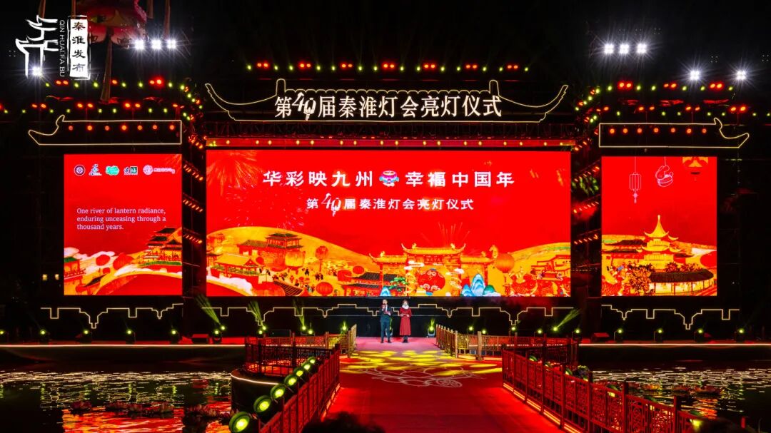 人们乘兴而来,手中摇曳的灯与天上皎洁的月,倒映在墨色的水波里,构成一幅流动了千年的金陵画卷。